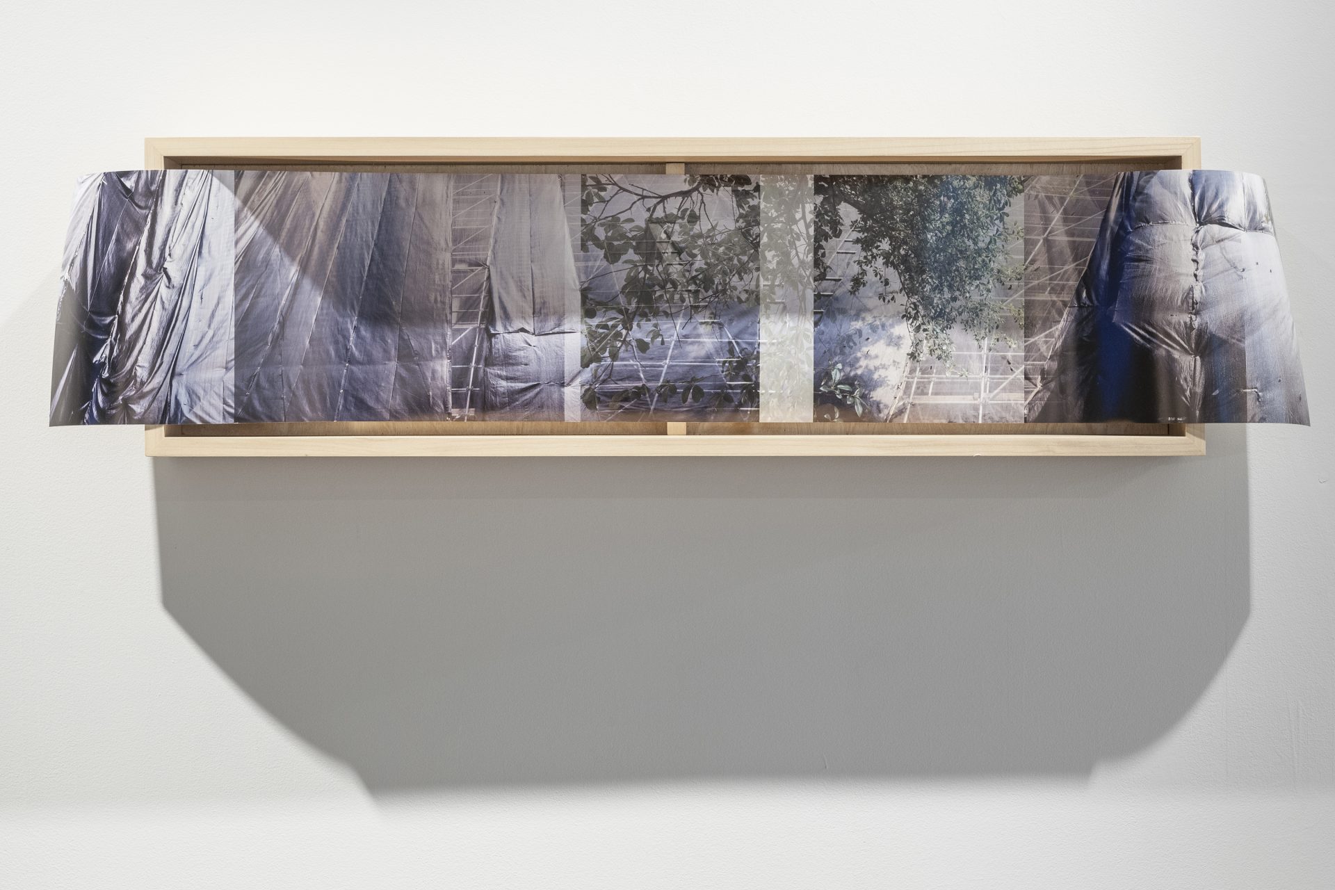 Regina Agu, Drape Panorama 02, 2017, Digital photo print and wood, 50 ¾ x 12 ½ x 5 ½ in., Collection of the artist, Installation view at DiverseWorks, Photo by Paul Hester © Regina Agu