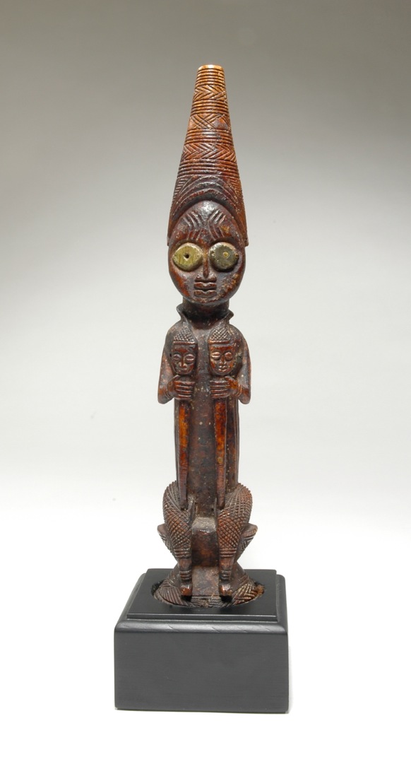 Seated Osugbo member with stone eyes, wearing edan ogboni around the neck, Yoruba artist, Nigeria, c. 16th century, Ivory and stone, Loan of Charles and Kent Davis