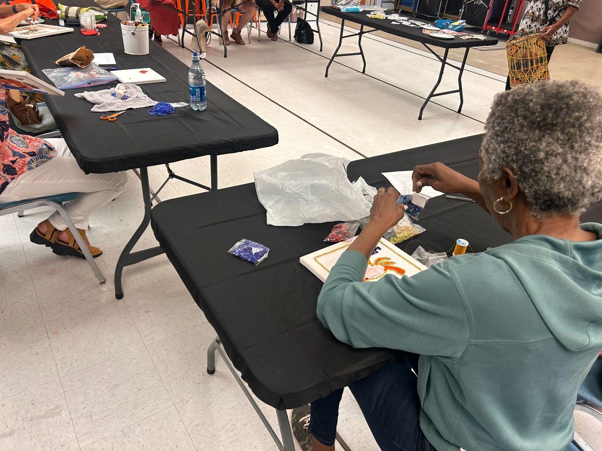 Wesley P. Phillips showed us how improvisation is used in the drumming rhythms that Black Masking Indians parade to. Participants were encouraged to come up and play the tambourine to the sound of the drum. Some of us showed off our best moves while others continued to bead to the sound of Wesley’s drum. We learned about the importance of the materials used to make the drums and the different sounds that each material provides. Participants beaded feverishly as our workshops were coming to a close. Finishing their pieces within the last meeting, participants brought in their pieces to be displayed for our showcase.