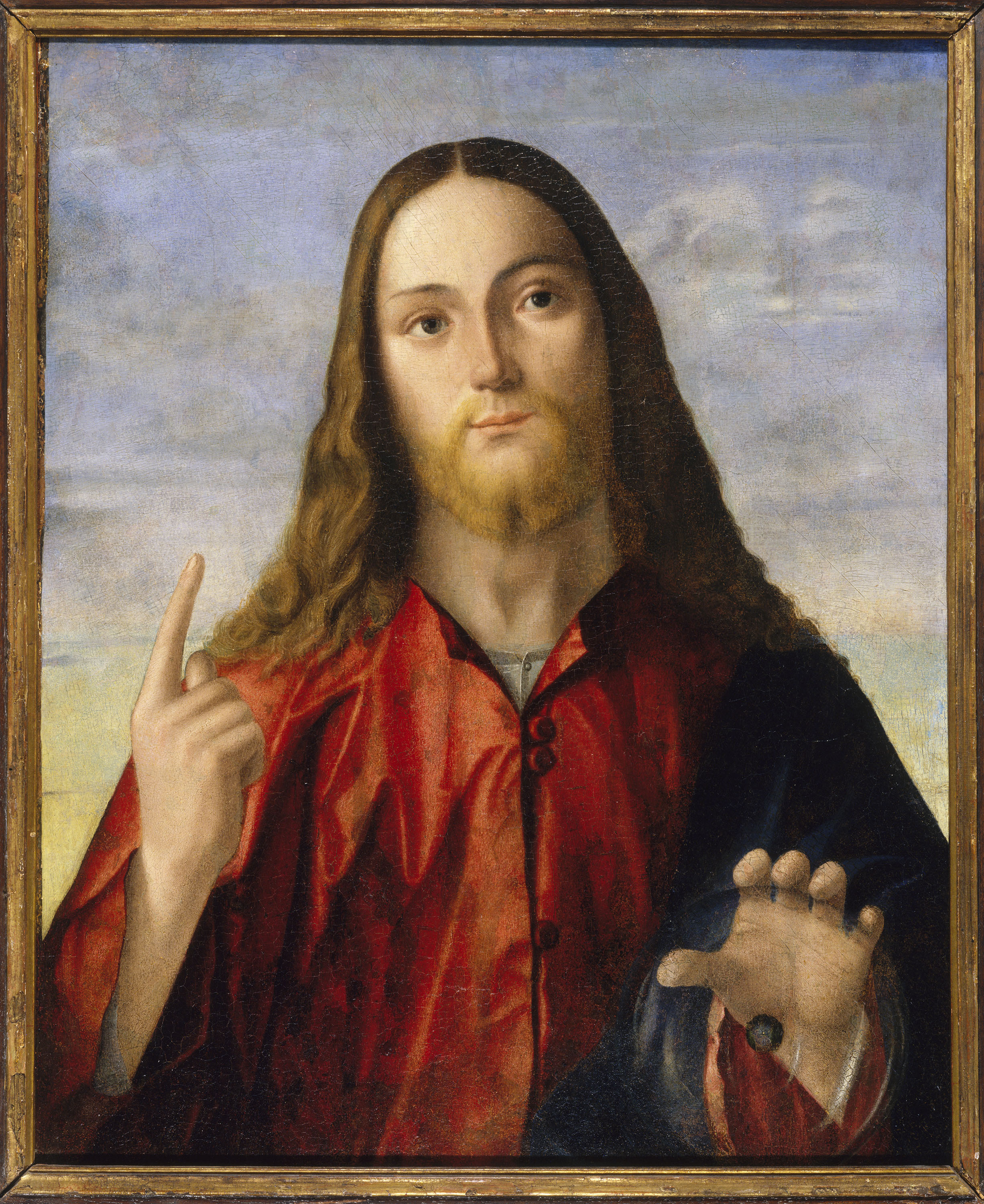 Christ holds his crystal orb, representing the celestial and earthly sphere over which he is the savior, in Latin the salvator mundi. The frontal composition stays true to the subject’s prototype: the Byzantine icon. In typical depictions of the subject Christ holds two fingers up in benediction, but here he points only one finger upward. This unique treatment is a direct reference to Leonardo da Vinci’s famous John the Bapist pointing upward toward the creator. Here Christ’s orb and gesture make reference to both God’s realm in heaven and earth and to Christ’s position as intercessor on earth.
