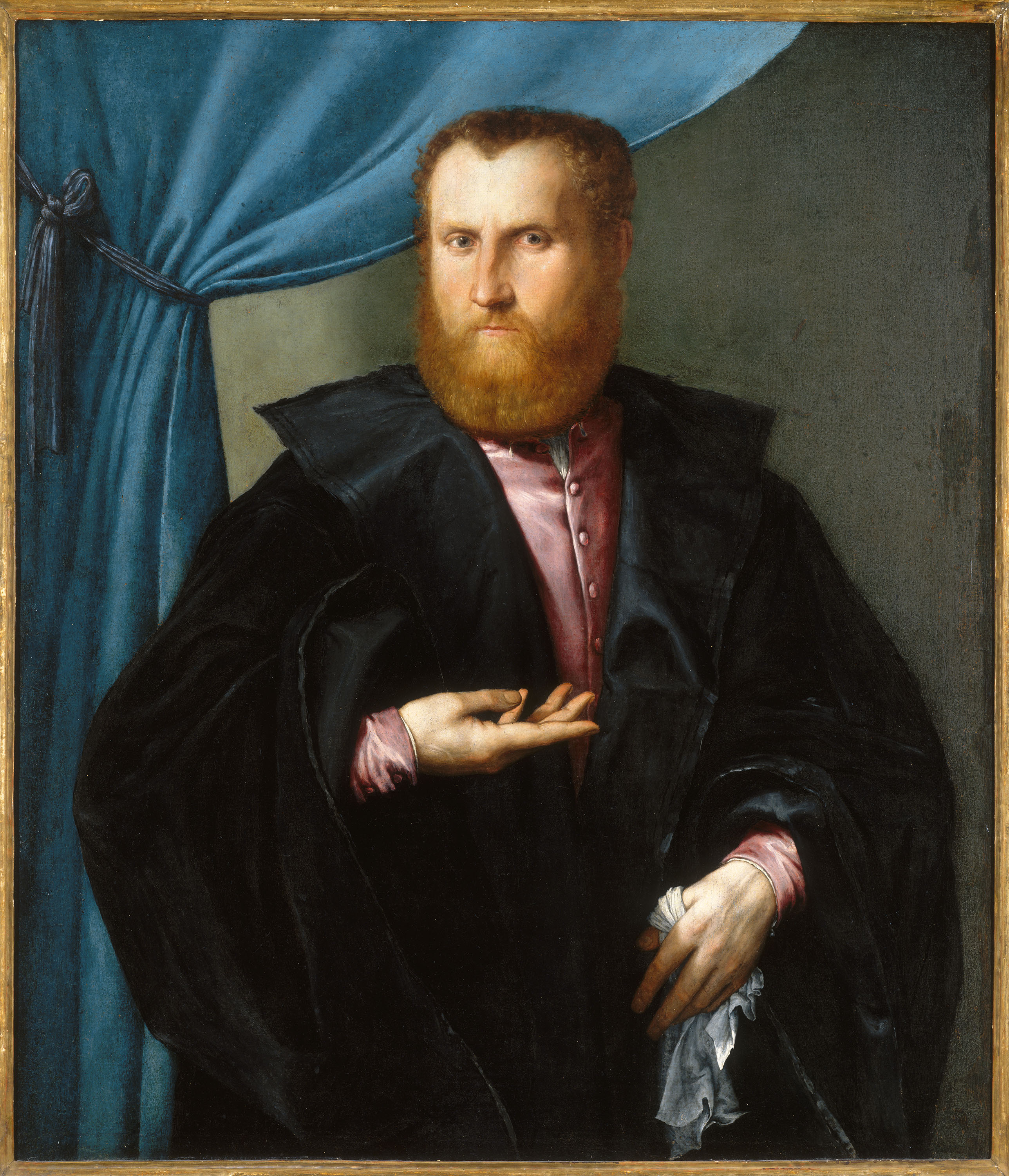The tight space between the blue curtain, cast shadow of the green wall and the picture’s frame are in tension with the hulking outline of this man’s cloak, his projected hand and improbably long nose. His wide collar adds to this imposing effect as does his large head and steely gaze. His mannered gesture is one of presentation and he holds a handkerchief of fine linen to signal gentility and status.