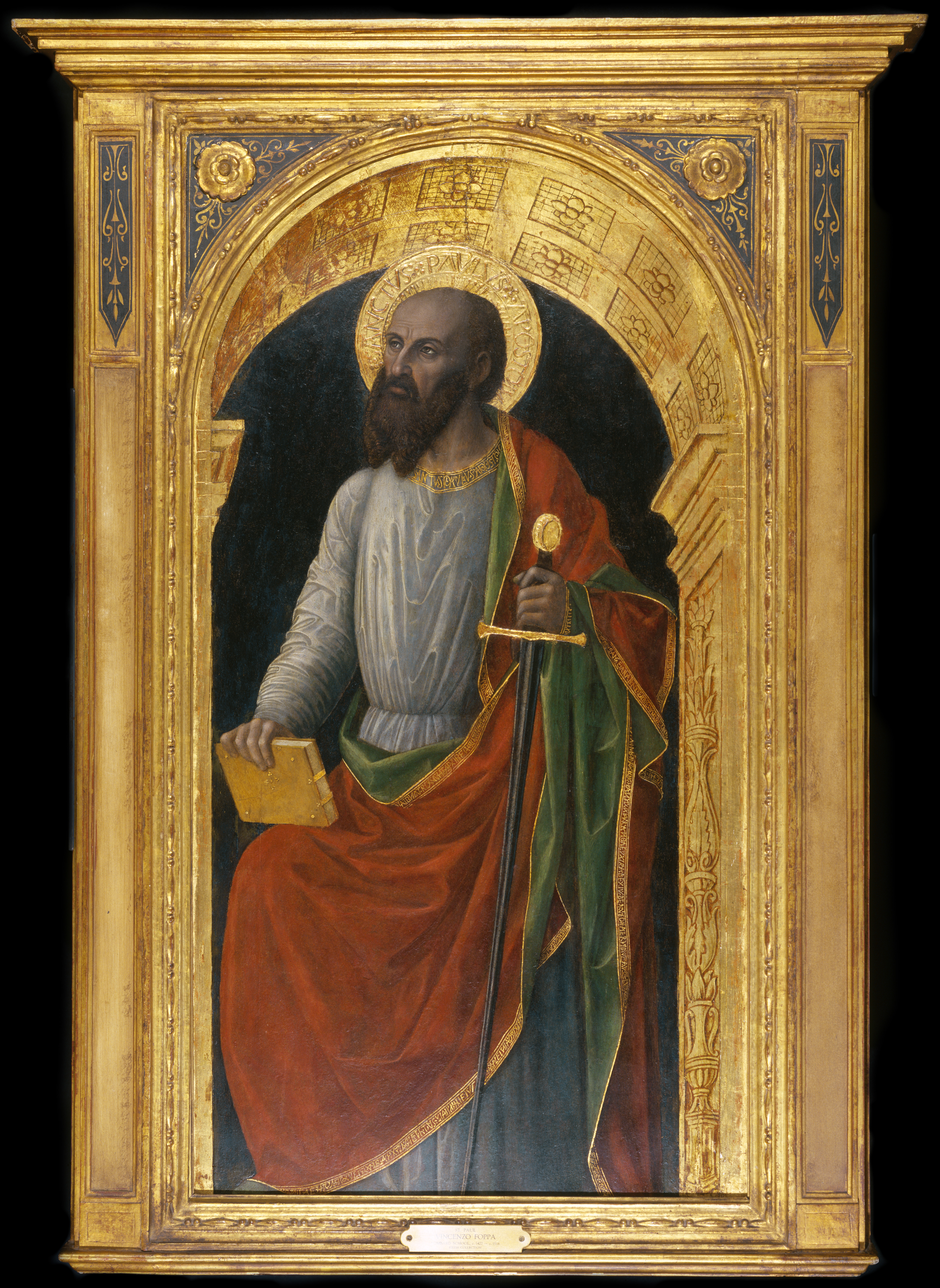 Vincenzo Foppa worked in Lombardy, north of Florence. In comparison with the other works from the Kress Collection, Foppa’s darker palette and dry, defined contours along with the realistic details in Paul’s craggy hair and glistening bald head achieve a gravitas befitting one of the church’s most important saints. The gilded decoration surrounding him uses directional incised lines to create a remarkably convincing barrel-vaulted space above and around our saint, at once situating him in space and projecting him forward, which amplifies the realistic effect of the sculptural painting technique.