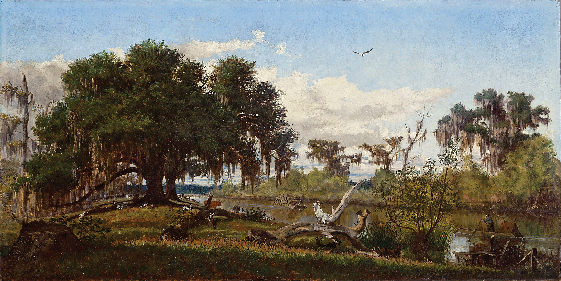 Everett B. D. Fabrino Julio, Life Along a Louisiana Bayou, 1877, Oil on canvas, 15 1/4 x 30 1/4 in., Collection of Roger Houston Ogden