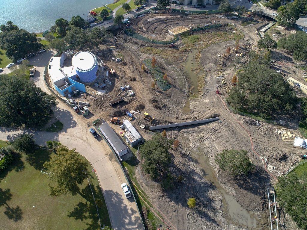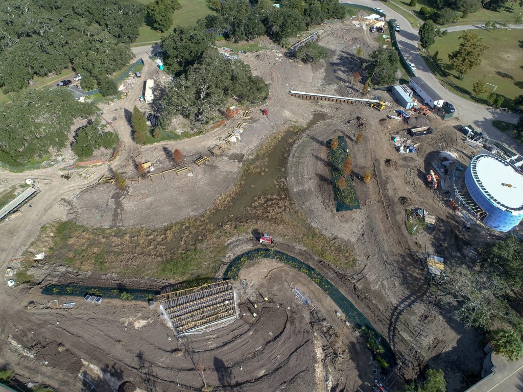 The steel is up on the outdoor pavilion, and as you can see from the images below, the walls are now up to close in the pavilion. All bridge and boardwalk supports have been installed, and the highly anticipated canal link bridge, also called a Moses Bridge due to the unique experience it provides of walking through water, is nearing completion. The amphitheatre and stage are also beginning to take shape.